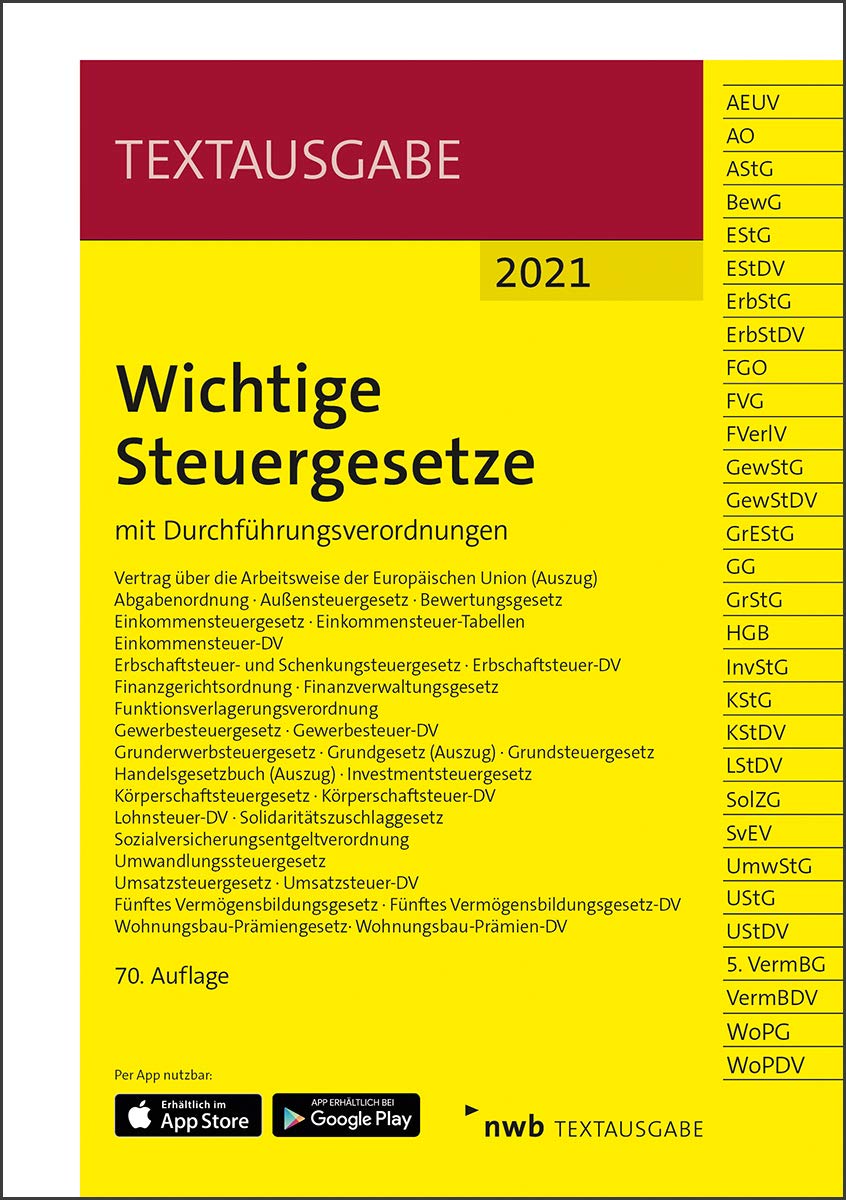 Alle wichtigen Steuergesetze fr die Praxis und Studium! Kompakt aktuell und preisgnstig in einem Band zusammengefasst. Eine wertvolle Arbeitshilfe fr die tglichen Aufgaben zu einem stimmigen Preis-Leistungsverhltnis. Der Klassiker in aktualisierter Neuauflage 2021. Mit App! Kompakt aktuell unentbehrlich seit vielen Jahren ist dieses Standardwerk eine wertvolle Arbeitshilfe fr Studium und Praxis. In einem Band vereint diese Textausgabe alle wichtigen Steuergesetze inklusive der Durchfhrungsverordnungen unter Bercksichtigung wichtiger Auszge aus Handelsgesetzbuch Grundgesetz und Vertrag ber die Arbeitsweise der Europischen Union. Die praktische Griffleiste die Paragraphenzuordnung die (nicht amtliche) Satzzhlung sowie die Hervorhebung der inhaltlichen nderungen gegenber der Vorauflage erleichtern das Arbeiten mit der Gesetzessammlung. Die 70. Auflage entspricht dem Stand vom 1. Januar 2021. Smtliche bis zu diesem Zeitpunkt ergangenen Rechtsnderungen sind bercksichtigt. Das gilt insbesondere fr die nderungen aufgrund folgender Gesetze: Jahressteuergesetz 2020. Zweites Gesetz zur steuerlichen Entlastung von Familien sowie zur Anpassung weiterer steuerlicher Regelungen. Gesetz zur Umsetzung steuerlicher Hilfsmanahmen zur Bewltigung der Corona-Krise. Zweites Gesetz zur Umsetzung steuerlicher Hilfsmanahmen zur Bewltigung der Corona-Krise. Inhaltsverzeichnis: I. Vertrag ber die Arbeitsweise der Europischen Union (AEUV) Auszug II. Abgabenordnung (AO) III. Gesetz ber die Besteuerung bei Auslandsbeziehungen (Auensteuergesetz AStG) IV. Bewertungsgesetz (BewG) V. Einkommensteuergesetz (EStG) VI. (1) Einkommensteuer-Grundtabelle 2021 (2) Einkommensteuer- Splittingtabelle 2021 VII. (1) Einkommensteuer-Grundtabelle 2022 (2) Einkommensteuer- Splittingtabelle 2022 VIII. Einkommensteuer-Durchfhrungsverordnung (EStDV) IX. Erbschaftsteuer- und Schenkungsteuergesetz (ErbStG) X. Erbschaftsteuer-Durchfhrungsverordnung (ErbStDV) XI. Finanzgerichtsordnung (FGO) XII. Gesetz ber die Finanzverwaltung (Finanzverwaltungsgesetz FVG) XIII. Verordnung zur Anwendung des Fremdvergleichsgrundsatzes nach 1 Abs. 1 des Auensteuergesetzes in Fllen grenzberschreitender Funktionsverlagerungen (Funktionsverlagerungsverordnung FVerlV) XIV. Gewerbesteuergesetz (GewStG) XV. Gewerbesteuer-Durchfhrungsverordnung (GewStDV) XVI. Grunderwerbsteuergesetz (GrEStG) XVII. Grundgesetz fr die Bundesrepublik Deutschland (GG) Auszug XVIII. (1) Grundsteuergesetz (GrStG) bis Kalenderjahr 2024 (2) Grundsteuergesetz (GrStG) ab Kalenderjahr 2025 XIX. Handelsgesetzbuch (HGB) Auszug XX. Investmentsteuergesetz (InvStG) XXI. Krperschaftsteuergesetz (KStG) XXII. Krperschaftsteuer-Durchfhrungsverordnung (KStDV) XXIII. Lohnsteuer-Durchfhrungsverordnung (LStDV) XXIV. Solidarittszuschlaggesetz (SolZG) XXV. Verordnung ber die sozialversicherungsrechtliche Beurteilung von Zuwendungen des Arbeitgebers als Arbeitsentgelt (Sozialversicherungsentgeltverordnung SvEV) XXVI. Umwandlungssteuergesetz (UmwStG) XXVII. Umsatzsteuergesetz (UStG) XXVIII. Umsatzsteuer-Durchfhrungsverordnung (UStDV) XXIX. Fnftes Gesetz zur Frderung der Vermgensbildung der Arbeitnehmer (Fnftes Vermgensbildungsgesetz 5. VermBG) XXX. Verordnung zur Durchfhrung des Fnften Vermgensbildungsgesetzes (Fnftes Vermgensbildungsgesetz-Durchfhrungsverordnung VermBDV) XXXI. Wohnungsbau-Prmiengesetz (WoPG) XXXII. Verordnung zur Durchfhrung des Wohnungsbau-Prmiengesetzes (WoPDV)